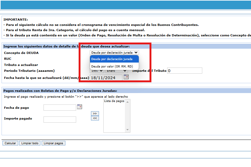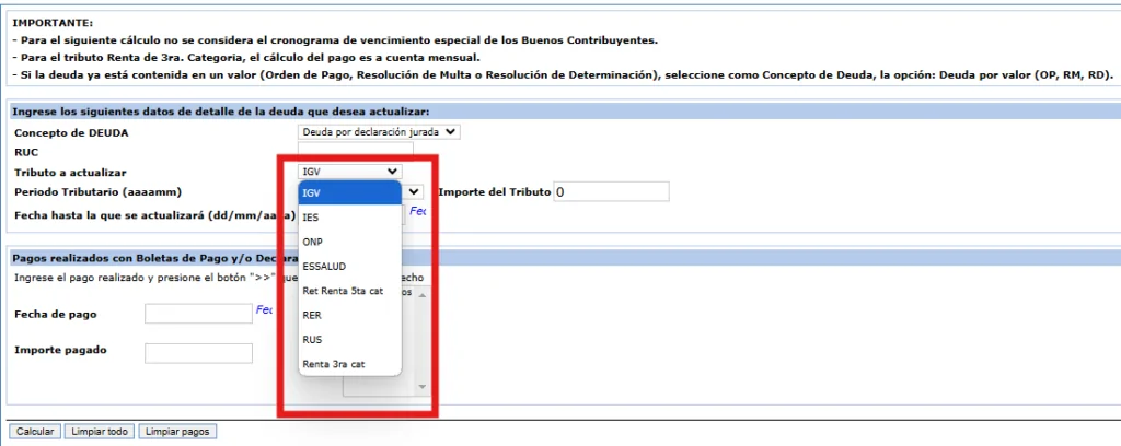 Decide si tu deuda es por una declaración jurada (como IGV, ONP, EsSalud, Retenciones de 5ta categoría, RER, RUS, o renta de 3ra categoría) o si se trata de una deuda basada en valor, como una Orden de Pago, Resolución de Multa o Resolución de Determinación.