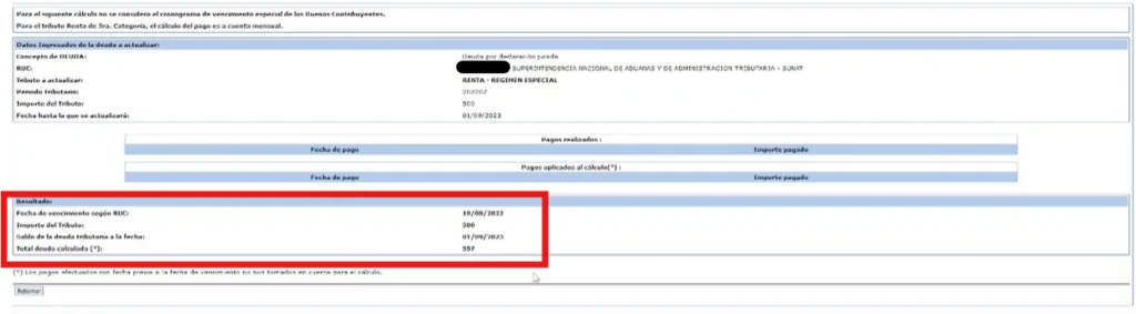 Y por ultimo, haz clic en «calcular». El sistema mostrara el detalle de la deuda.