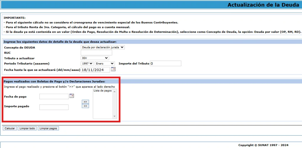 Si realizaste pagos parciales después de la fecha límite, deberás ingresar estos detalles. Esto permitirá que el cálculo de los intereses sea preciso, teniendo en cuenta cada monto abonado después del vencimiento.