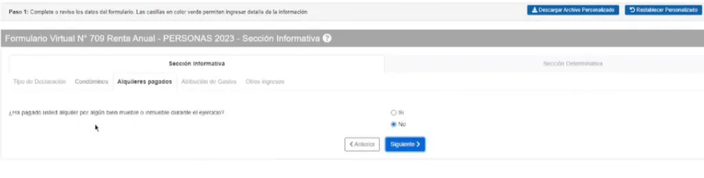 Responde la consulta del sistema si ha pagado por algun bien o inmueble durante el ejercicio, y haz clic en «siguiente»