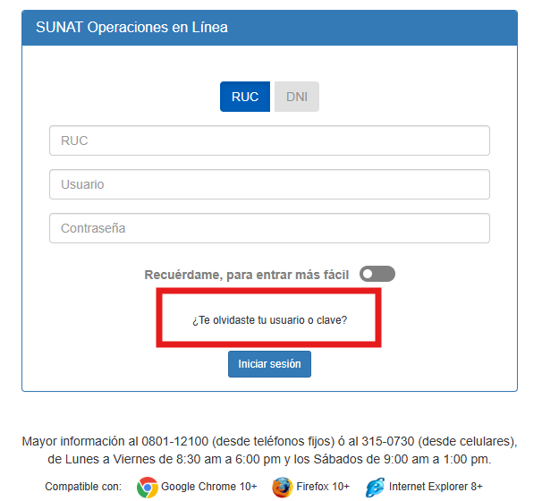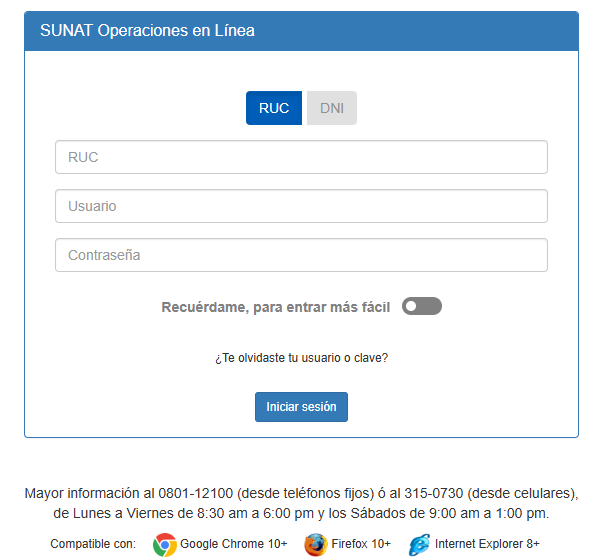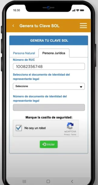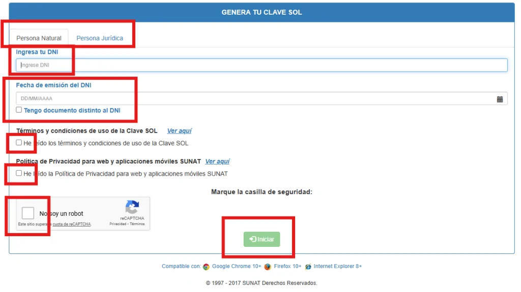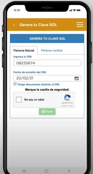 Si eres persona natural digita el dni y su fecha de emisión. De tener un documento distinto al dni o eres persona jurídica registra tu número de ruc, marca la casilla de seguridad y presiona iniciar