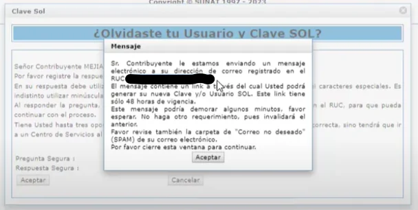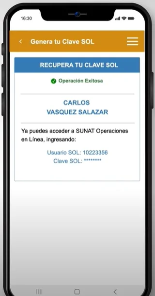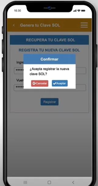 Acepta el registro de tu nueva clave sol. Al confirmar el proceso el sistema te mostrará el mensaje operación exitosa