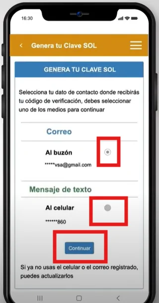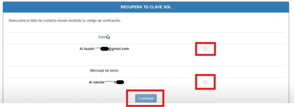 Selecciona los datos de contacto que registraste, correo electrónico o celular para enviarte el código de verificación. Para el caso de persona jurídica se debe marcar ambos medios de contacto, luego debes presionar continuar.